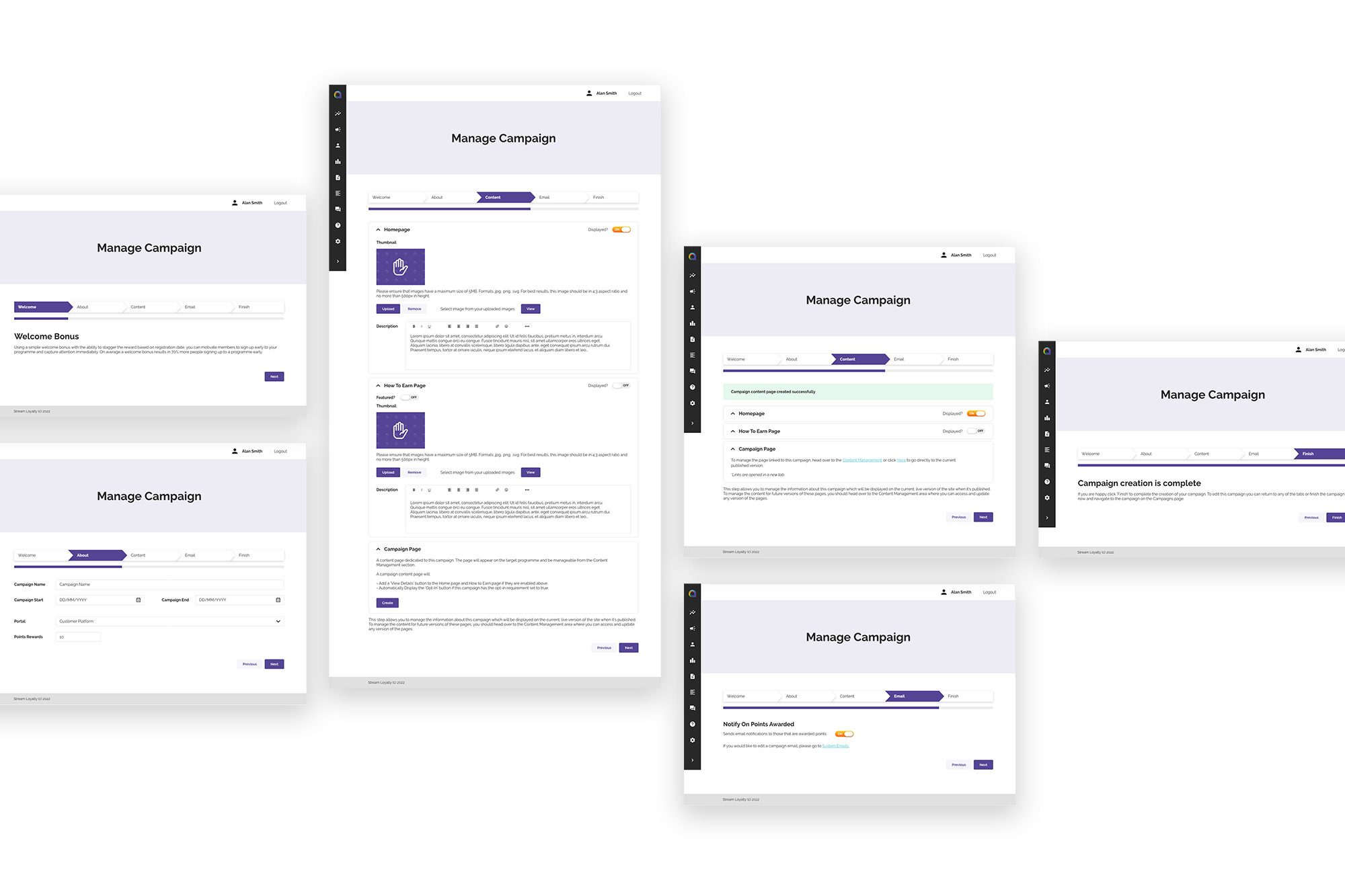 The SolutionWorking with the development team at Stream Loyalty, together we created some basic wireframes to map out the admin portal. From there we were able to present the initial vision of the portal to the directors for approval. With this then all being checked off I was then able to move into creating high resolution wireframes and web assets. We opted to use a side navigation for its effectiveness in scalability. We can show double the number of navigation links in the side navigation as we would in a header navigation. From the home page clients can view statistics of how well their loyalty programmes are performing and create their own data collectors to appear in the insights tab. Creating campaigns couldn’t be simpler with the catalogue of ready-made campaign built in the programme. Editing site pages in real time and easy to use branding page. Build, edit and send programme emails or SMS. Downloading report from the past week, month or year straight into an excel spreadsheet and import data on your sales, customer or products to keep the programme up to date.